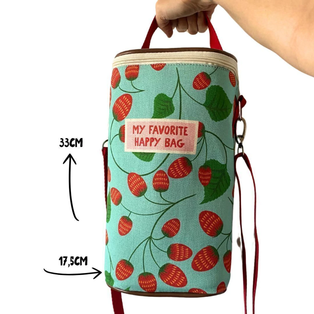 Em lona de algodão grossa, estampada, com plaquinha esmaltada (um charmeee), com forro térmico plástico e capacidade para 2 garrafas.
